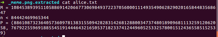 In our challenge, we also have one extra value in the file alice.txt extracted from meme.png: M. This made