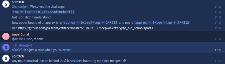 Note: We still don’t have a strong mathematical explanation as to why $ q\_approx = 0xbeef*tmp\_approx - 2^{500} $ and not $ q\_approx = 0xbeef*tmp\_approx + 2^{500} $, we deduced the formula based on the writeup for Meepwn CTF challenge mentioned earlier.