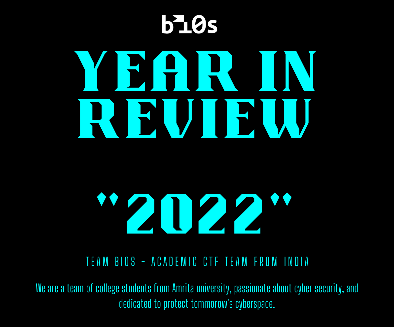 Team bi0s is a student-run cybersecurity club of Amrita Vishwa Vidyapeetham, Amritapuri (Kerala). The club is focused on building students and individuals with interdisciplinary skills in the field of cybersecurity and has a prosperous history spanning for more than a decade. The team has been the top performer in the well-known cybersecurity contest - ‘Capture The Flag’, in the national and international arena.